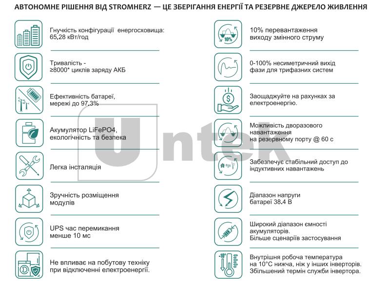 Комерційна система акумулювання енергії S-50K-3Р-40А-ESS-UA 23,04кВт від провідного австрійського виробника Stromherz це інтелектуальні гібридні системи збереження енергії великих об'ємів, які перетворюють енергію сонця в акумулятори на цілодобовий ресурс, одночасно пропонуючи резервне живлення у разі збою в електромережі. Stromherz зберігає, знижує витрати на енергію, покращує стійкість мережі.