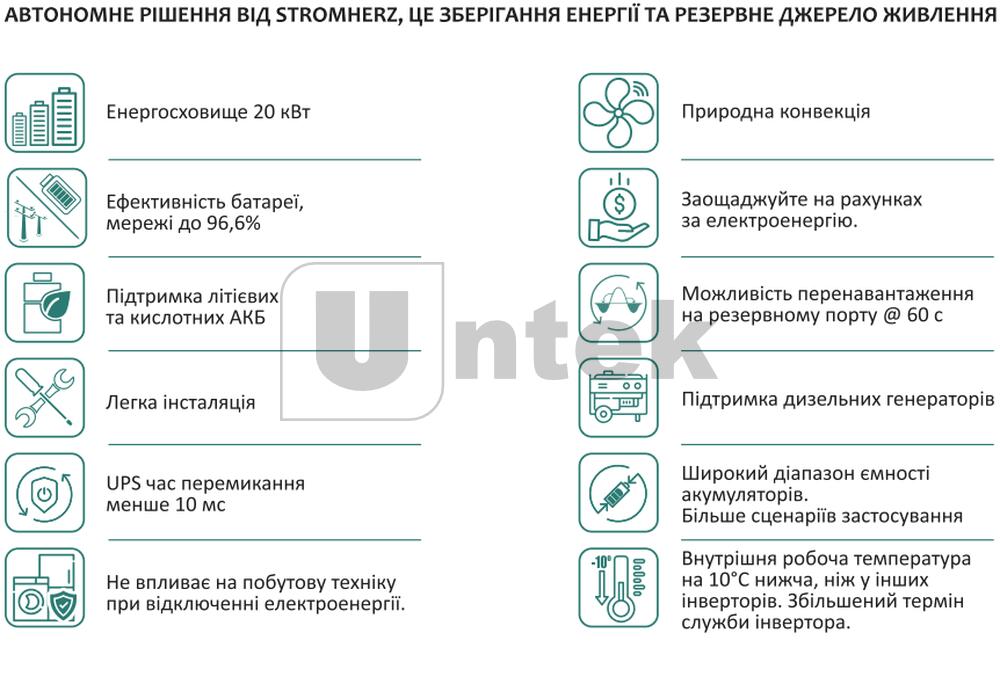 Гібридні низьковольтні інвертори від провідного австрійського виробника Stromherz це інтелектуальні гібридні системи збереження енергії, які перетворюють енергію сонця в акумулятори на цілодобовий ресурс, одночасно пропонуючи резервне живлення у разі збою в електромережі. Stromherz зберігає, знижує витрати на енергію, покращує стійкість мережі. Інвертори є найкращою пропозицією на ринку за співвідношенням ціна-якість.