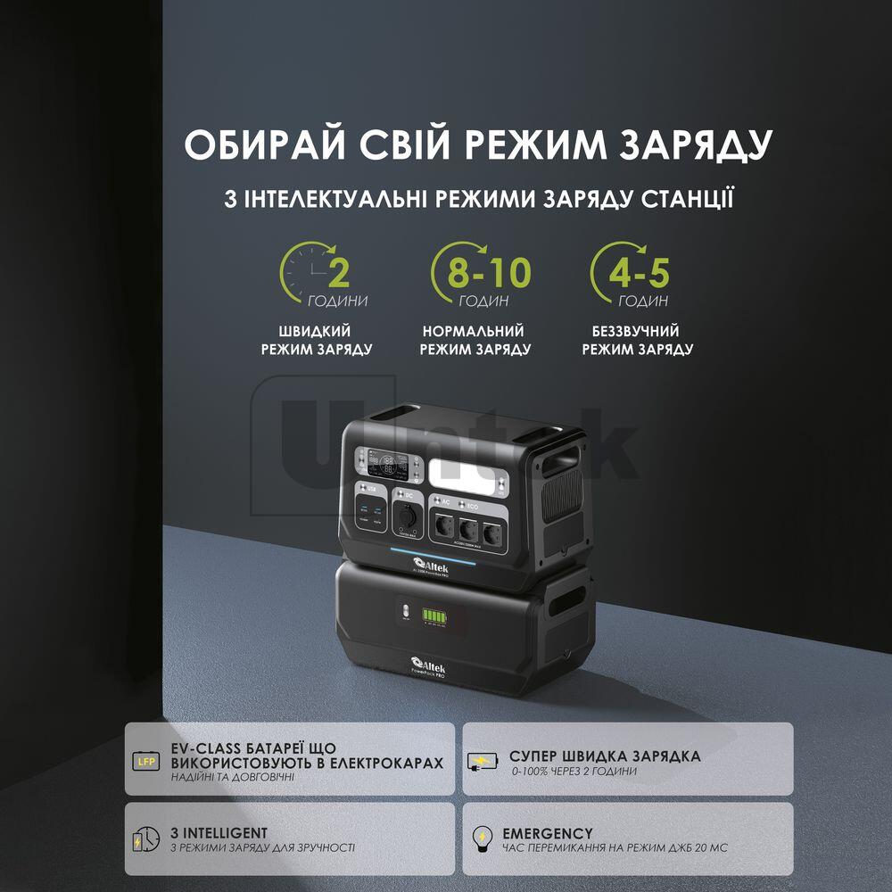 Портативні станції ALTEK можна заряджати від мережі 220В, автомобільного прикурювача, сонячних панелей або генератора. Станції ALTEK оснащенні сучасними акумуляторами LiFePO4, класу електромобілів EV.