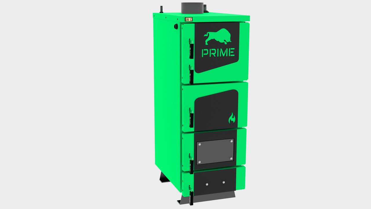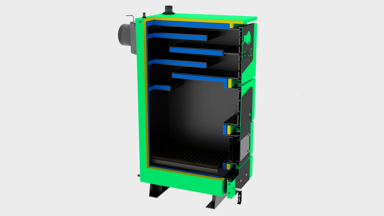 Твердопаливний котел серії Prime, представляє собою конструкцію з поличним теплообмінником в верхній частині котла. В експлуатації даний вид теплообмінника найлегше обслуговувати.